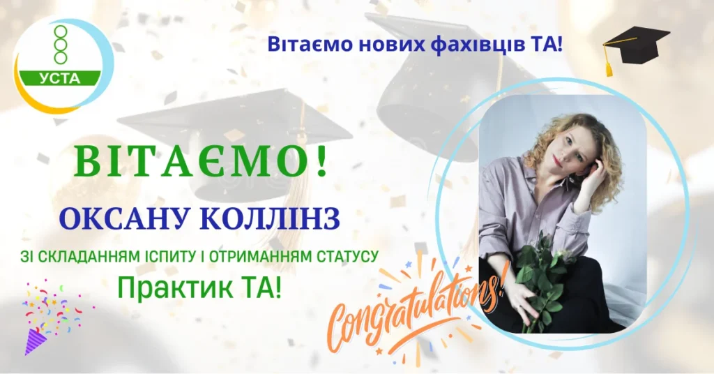 ГО “УСТА” щиро вітає Оксану Коллінз з успішним складанням іспиту та отриманням статусу Практик ТА!